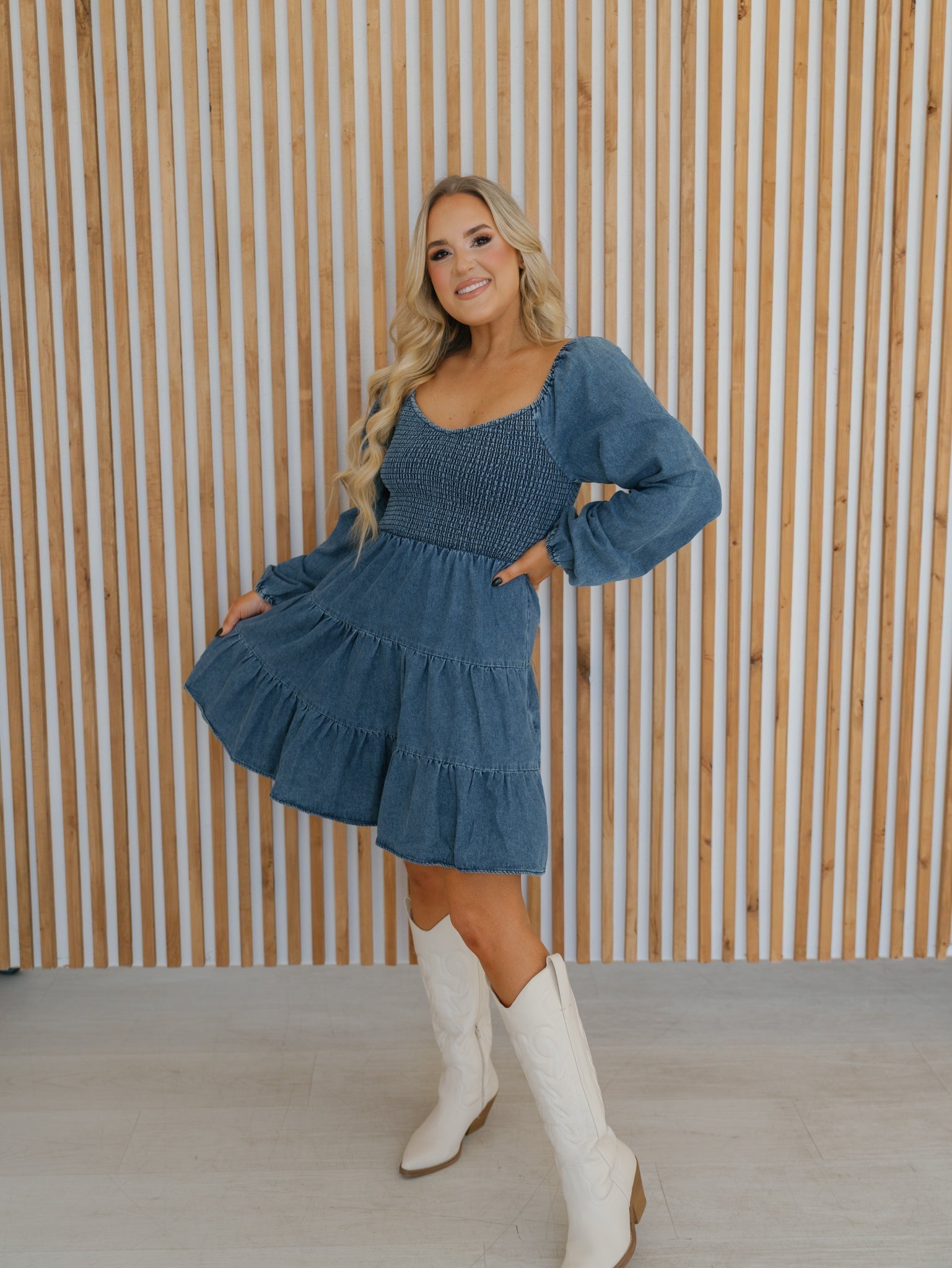 Twirl around in the "Hope Mini Dress!" A timeless staple for any wardrobe, this denim mini dress is complete with a fully smocked bust and back, long balloon sleeves, and a tiered skirt. Perfect for any casual day on the town, a girls brunch, or dressed up for a baby shower!